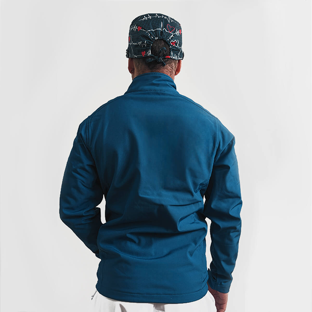Chaqueta médica negra softshell, presenta cierre de cremallera, puños ajustables y múltiples bolsillos, ideal para profesionales sanitarios.